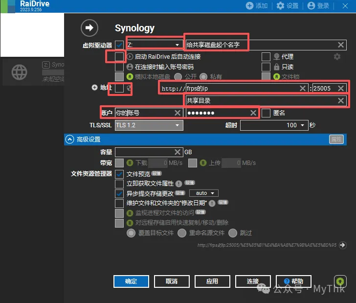 e. 【端口】群晖默认webdav端口是tcp 5005和5006,在刚才的配置里把它们映射到了A办公室frps服务器的25005和25006,所以这里应该填25005(如果没勾选地址旁边的选择框,代表使用http)或者25006(如果勾选了)。